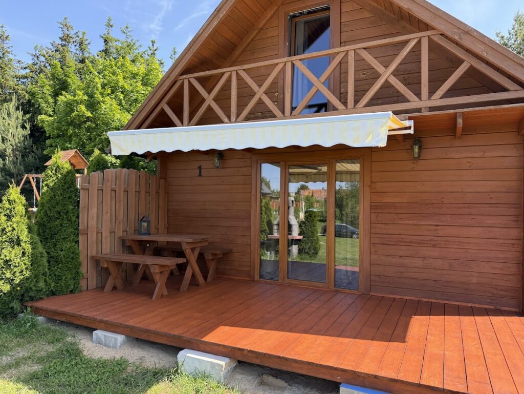 Oferujemy cztery komfortowe domki letniskowe. Dwa z nich to piętrowe obiekty, które zapewniają przestronną sypialnię na górze z czterema pojedynczymi łóżkami oraz tarasem z balustradą. Na parterze znajduje się wygodna rozkładana kanapa, w pełni wyposażony aneks kuchenny i łazienka z prysznicem. Na zewnątrz taras z meblami ogrodowymi, markizą, grill betonowy oraz hamak. Cena wynosi 500 zł za dobę, bez względu na liczbę osób.