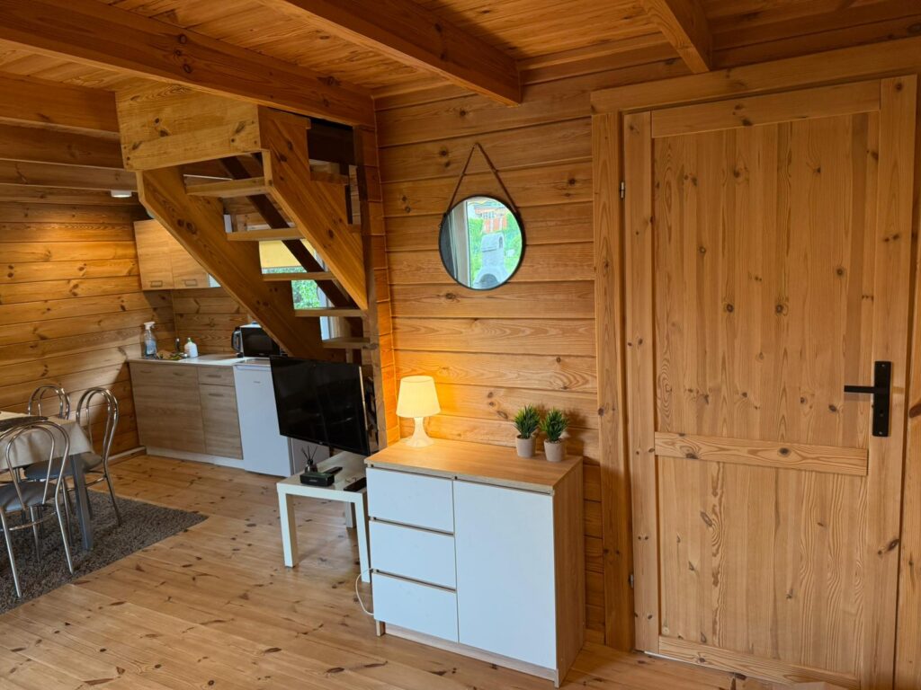 Dwa parterowe domki oferują dwie oddzielne sypialnie z łóżkami małżeńskimi oraz wygodną rozkładaną kanapę w salonie. W domkach znajduje się także biokominek, w pełni wyposażony aneks kuchenny, przestronny taras z meblami ogrodowymi, hamakiem i grill betonowy. Cena za dobę to 500 zł, niezależnie od liczby osób. Odległość do jeziora wynosi około 200 m, a w pobliżu znajdują się pomosty i dogodne miejsca do kąpieli oraz wędkowania. Goście mogą skorzystać z wypożyczenia rowerów wodnych.